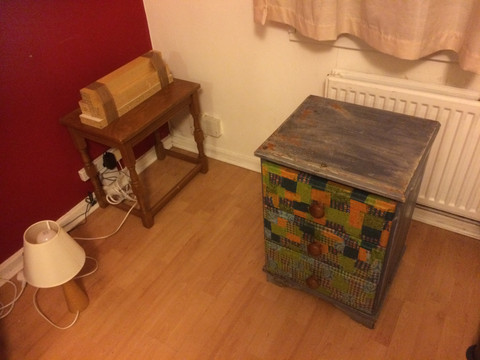 At first, I found a couple of sheets of thin plywood which I rested between a bedside table and a lower table with some pieces of wood propped on top to make it the same height. This wasn’t great, as the plywood was too thin and would bow under any pressure like writing or typing on it.