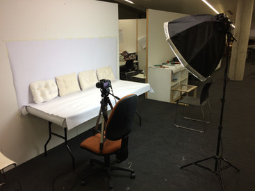 Examples of model photography and filming set-up in studio (above) compared with in my flat (below)